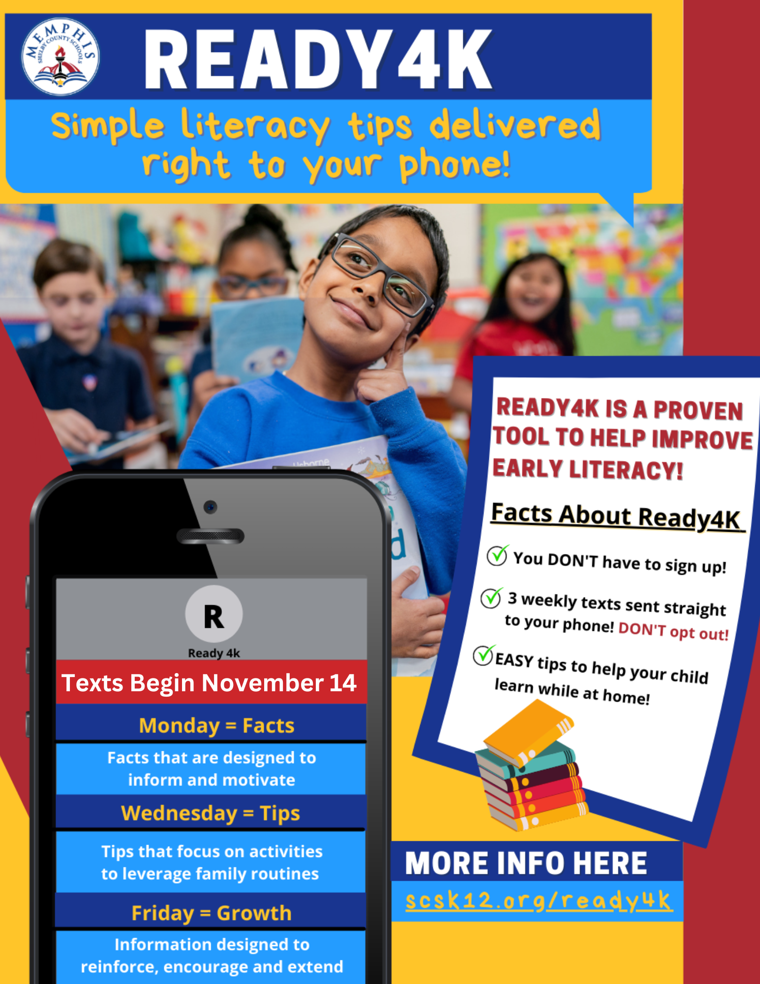 You don’t have to sign up for Ready4K texts. Just don’t opt out! Get three Ready4K texts per week with fun facts and engaging literacy tips to help your child continue to learn while at home. The messages match each child’s age, even if you have more than one child. Ready4K tips are easy because they build on daily home routines, like getting dressed, bath time, or preparing a meal. Parents can expect 3 texts per week (Monday=Facts, Wednesdays=Tip, and Fridays=Growth).Monday/Facts- designed to inform and motivate Wednesday/Tips- focuses on activities leveraging family routines Friday/Growth- designed to reinforce, encourage and extend More than 4 million Ready4k text messages have been sent to MSCS families since we launched in Spring 2021. More than 30,000 MSCS families (Pre-K – 4th grade) remain actively enrolled in Ready4k.