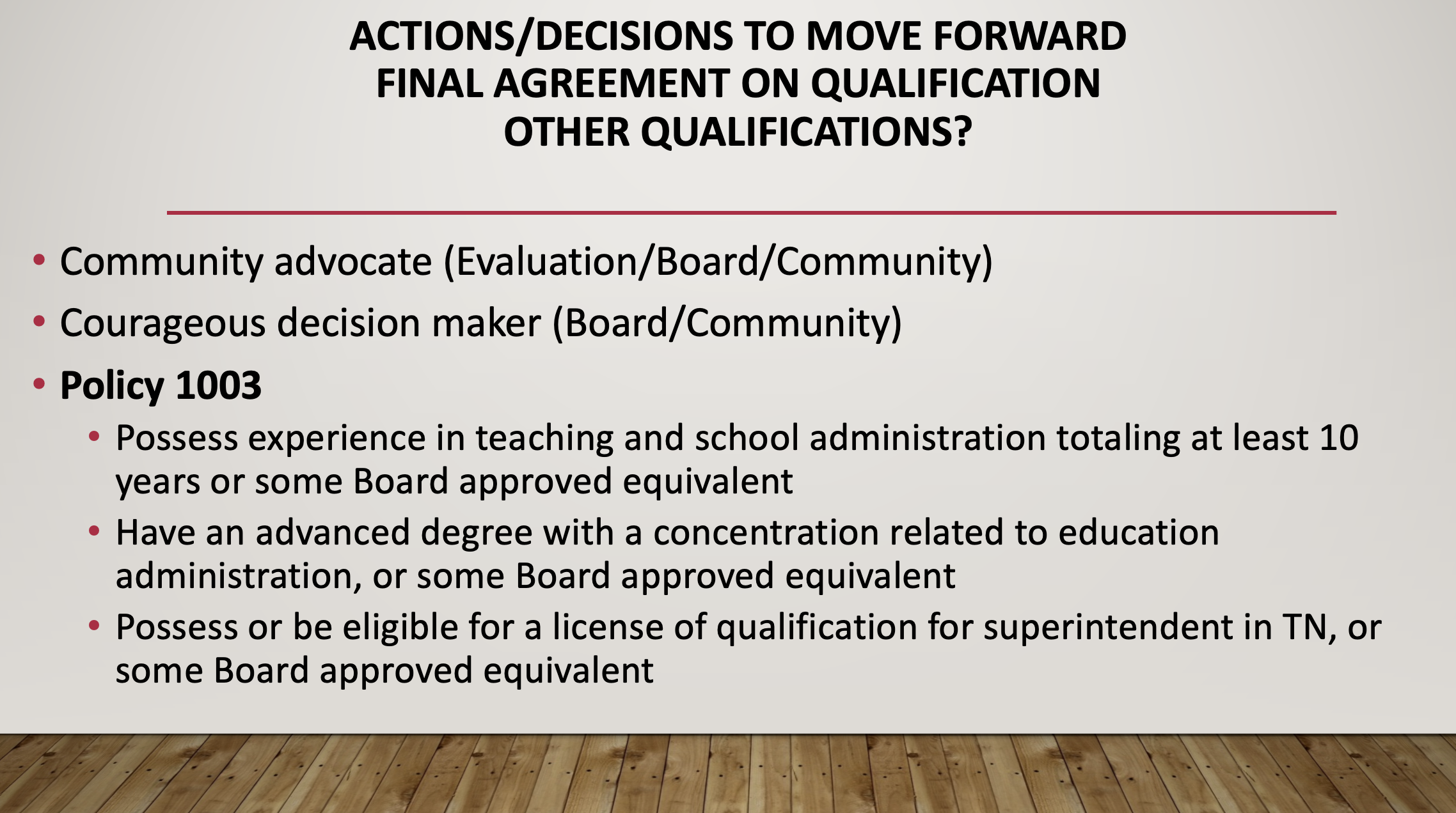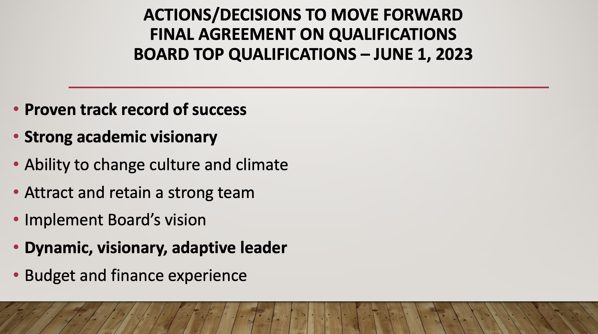 The Board came to an agreement on qualifications they'd like to see in candidates for the role of superintendent. They include the following: