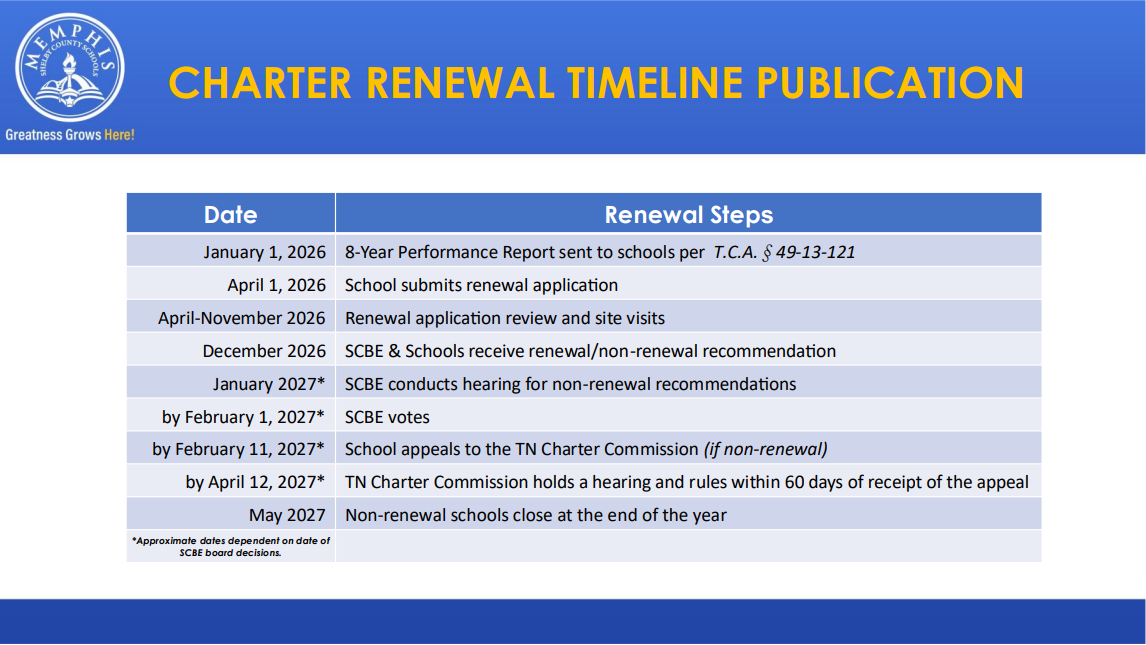 Please refer to Shelby County School’s Board Policy 1011, Section XII for more information about charter renewals, including renewal eligibility, evaluation criteria, reports, and decisions. The timeline below has been approved by the board per SCBE 1011.