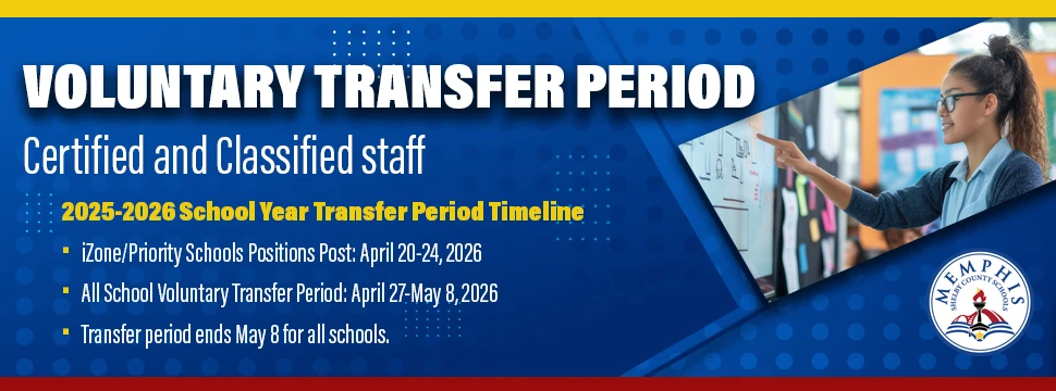 The MSCS Department of Human Resources is pleased to officially open the Voluntary Transfer Period from Monday, April 20 through Friday, May 8 for certified and classified staff.