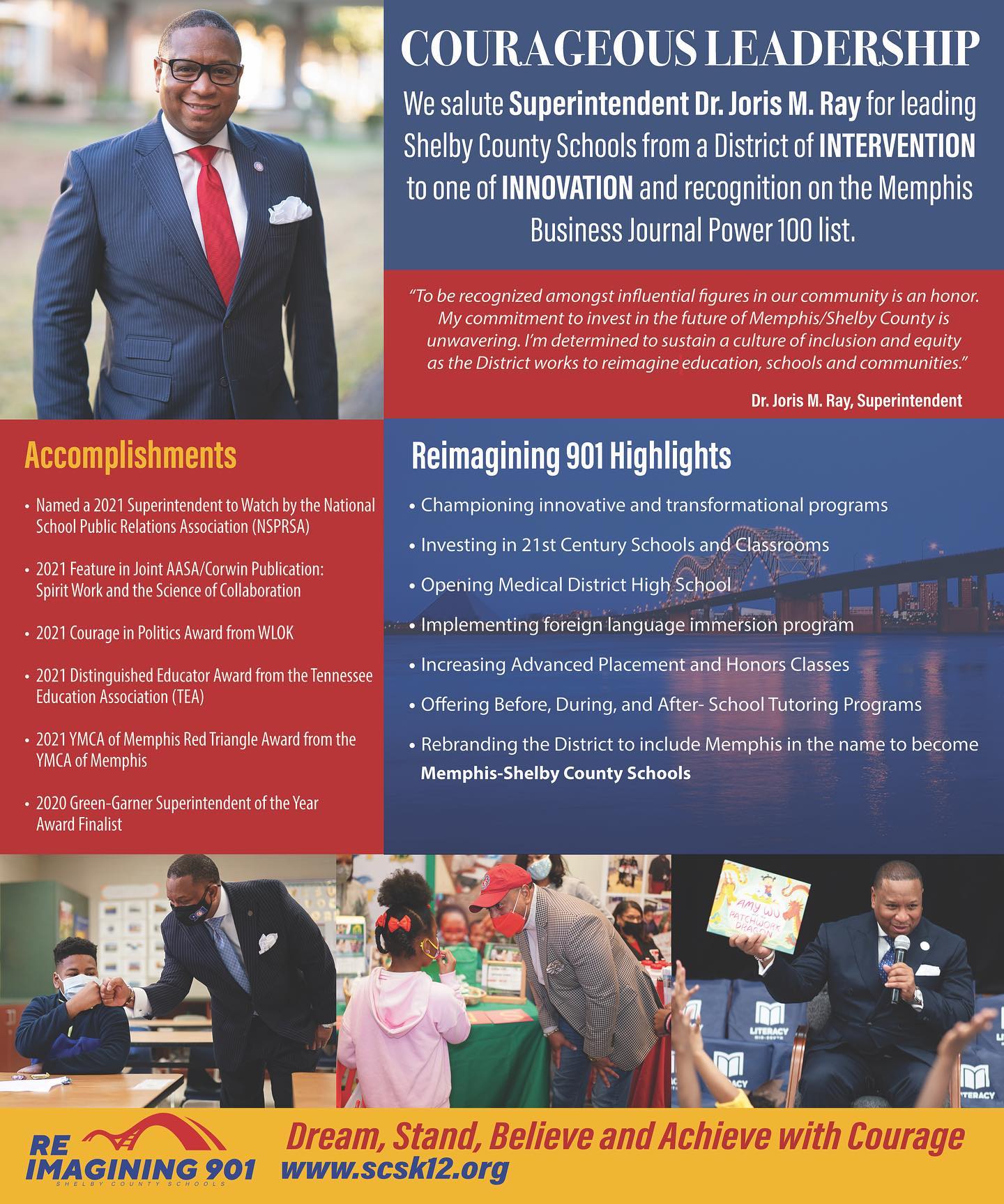 Memphis-Shelby County Schools (MSCS) Superintendent Dr. Joris M. Ray has been named to the Memphis Business Journal (MBJ) Power 100 list for the third consecutive year. The publication highlights the most influential leaders in the past year across the Bluff City.