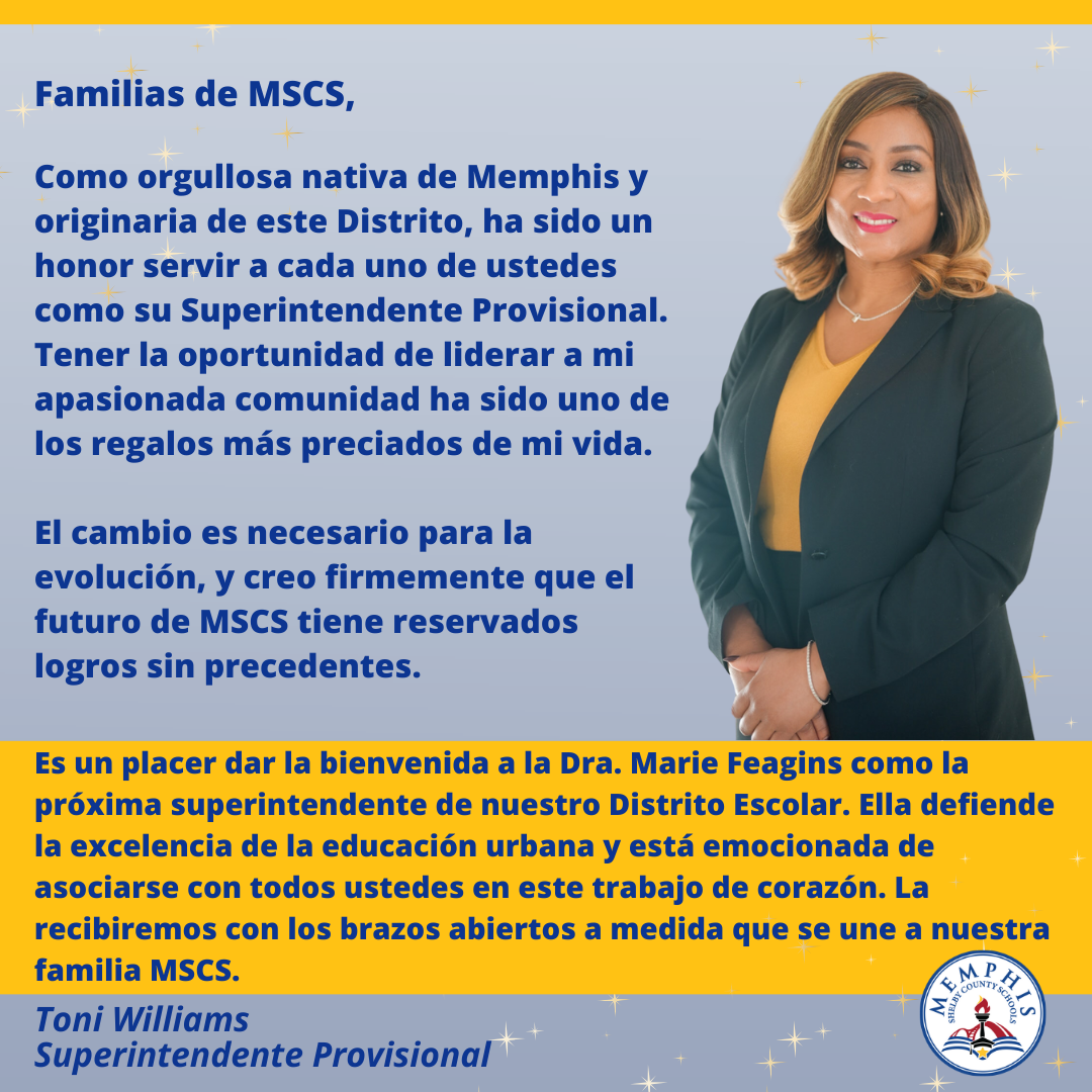 El cambio es necesario para la evolución, y creo firmemente que el futuro de MSCS tiene reservados logros sin precedentes. Es un placer dar la bienvenida a la Dra. Marie Feagins como la próxima superintendente de nuestro Distrito Escolar. Ella defiende la excelencia de la educación urbana y está emocionada de asociarse con todos ustedes en este trabajo de corazón. La recibiremos con los brazos abiertos a medida que se une a nuestra familia MSCS.