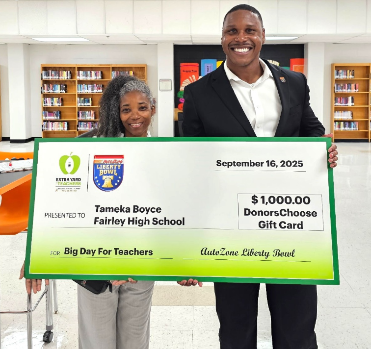 Tameka Boyce, maestra de inglés en Fairley High School, recibió recientemente una donación de $1,000 gracias a una colaboración entre AutoZone Liberty Bowl y College Football Playoff Foundation (CFP, por sus siglas en inglés) . Los fondos se pueden destinar a recursos educativos para el aula o las alumnas y los alumnos, y a proyectos que contribuyan a su aprendizaje.